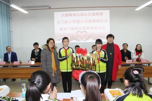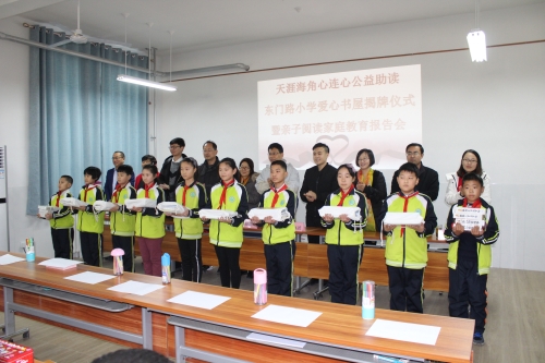 好书不厌读百回,熟读深思子自知。为鼓励同学们多读书、读好书,东门路小学积极与山东省读书推动优秀团队——“天涯海角心连心”公益助读团队取得联系,启动了天涯海角心连心公益助读东门路小学爱心书屋暨亲子阅读家庭教育报告会活动。生活日报主编、山东省第一阅读推广人赵世峰,中科院心理研究所在职博士、国家二级心理咨询师、济南市公安局民警屈强,山东省外国语学院团委书记马海波,山东大学外国语学院团委书记吕鹏飞等参加活动。 东门路小学爱心书屋是“天涯海角心连心”公益助读团队走进淄博的第一家,在启动仪式上,“天涯海角心连心”公益助读团队发起人山东省实验中学高级教师高惠燕老师为天涯海角心连心东门路小学爱心书屋揭牌。活动中,团队代表介绍了后期助读活动安排,为家长们进行了精彩的亲子阅读家庭教育专题讲座。最后,免费为东门路小学爱心书屋捐赠570册图书,有适合不同年龄学生的绘本、童话、名著等,还有帮家长们改善亲子关系促进家庭教育的各类书籍。 这次活动,以“汇聚爱心,倾情阅读,服务全校学生和家长”为宗旨,通过爱心志愿者的助读行动,为学校和家庭搭建了一个充分阅读、分享交流的平台,帮助学生养成从小热爱阅读的好习惯。 | |||