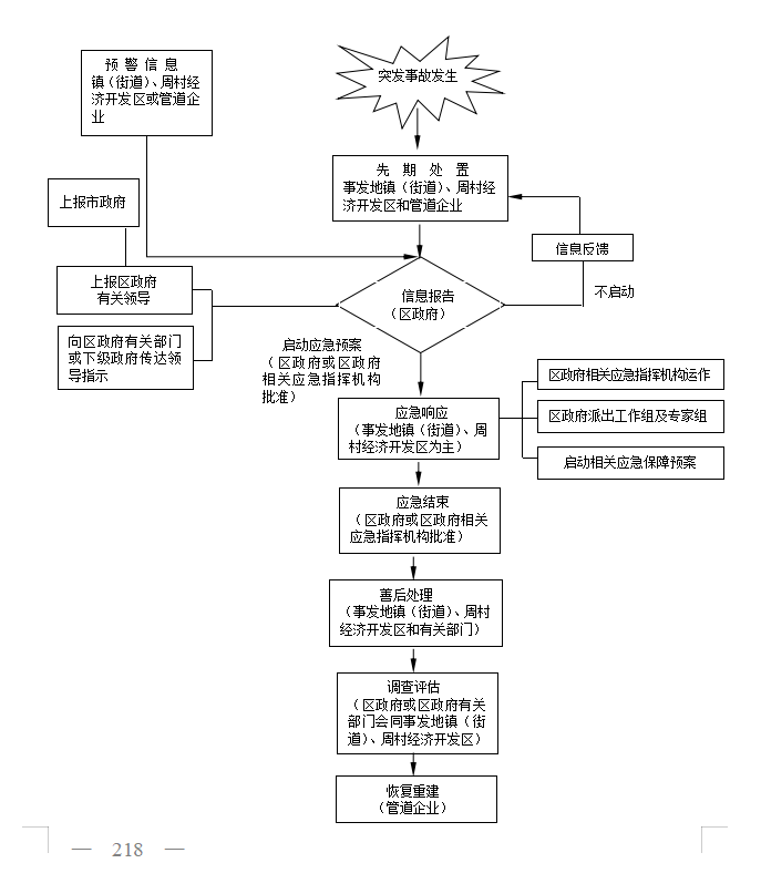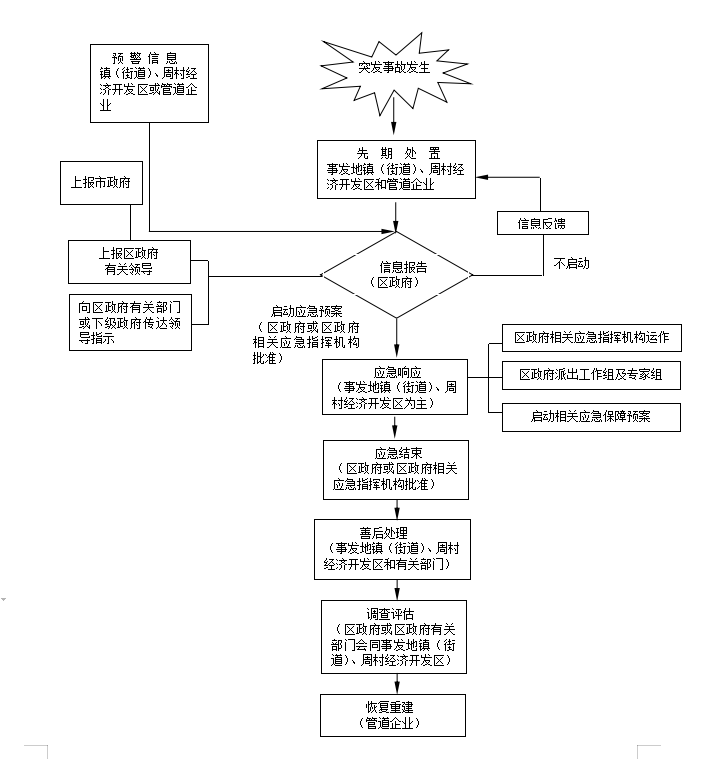 一般管道设施事故发生后,我区按照本预案规定进行应急处置。较大及较大以上管道设施事故发生后,我区按照省、市应急指挥部的安排,进行相关应急处置,并按照本预案规定做好前期处置工作。