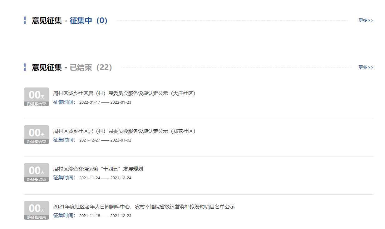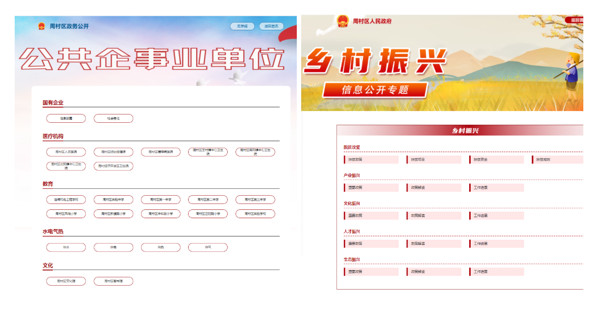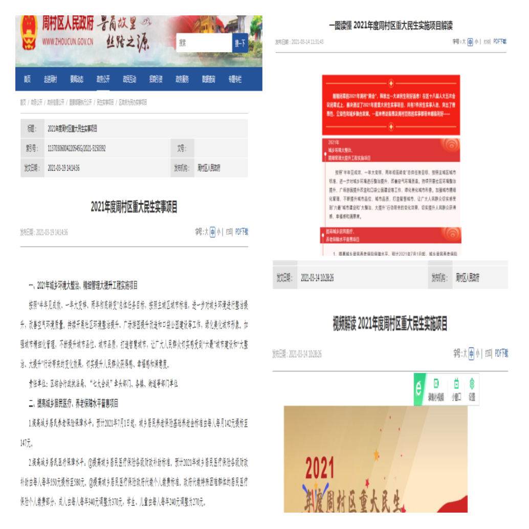 (1)新建“机构职能”专栏,全面梳理公布区政府部门单位基本信息,包括单位名称、办公时间、办公地址、联系电话等,统一格式,一目了然。(2)贯彻落实行政执法公示制度。建立“行政执法”专栏,集中向社会依法公开本单位行政执法事项清单、执法人员名单、执法结果等。(3)新建“重大建设项目”专栏,集中公开2021年周村区重大建设项目的批准结果信息、招标投标信息、征收土地信息、施工有关信息、质量安全监督信息等。