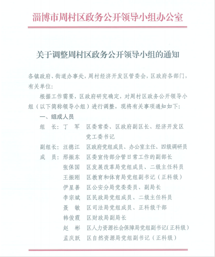 区委常委、区政府副区长、经济开发区党工委书记丁军担任周村区政务公开领导小组组长。定期召集相关单位召开协调推进会议,调度督导工作进展、研究解决突出问题,提高各单位重视程度。
