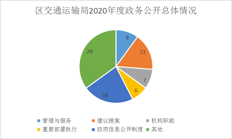 2020年度我局将除涉及国家秘密、商业机密和个人隐私以外的政府信息主动通过政府网站、政府信息查阅场所、信息告知栏等渠道和方式向社会进行了公开。本年度我局主动公开政府信息80条,公开内容主要涉及交通信息、机构职能、政务公开、政策法规、便民服务、营商环境、财政信息等方面。收到并办理人大代表建议7件,政协提案4件,主要涉及交通规划、路灯安装、老年代步车管理等,截至目前本年度接收的建议提案已全部按时答复,满意率100%。