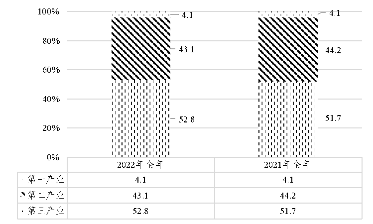 经济总量稳步增长。根据县级生产总值统一核算结果,2022年全区生产总值为251.20亿元,按可比价格计算,同比增长2.3%。其中,第一产业增加值为10.32亿元,同比增长3.0%;第二产业增加值为108.19亿元,同比增长0.3%;第三产业增加值为132.69亿元,同比增长3.7%。三次产业占比调整为4.1:43.1:52.8,第三产业占比同比提高1.1个百分点。