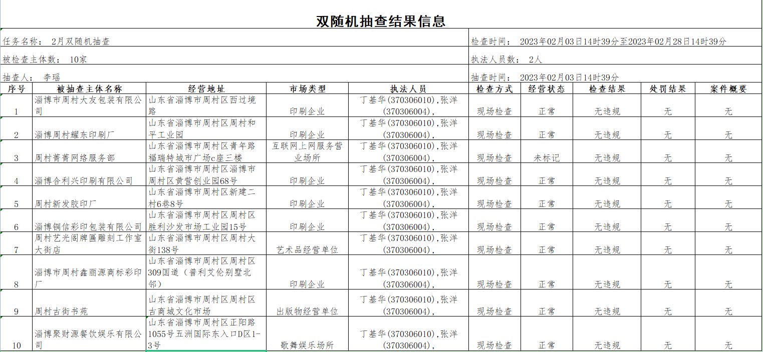 周村区文化和旅游局2023年2月“双随机、一公开”抽查结果