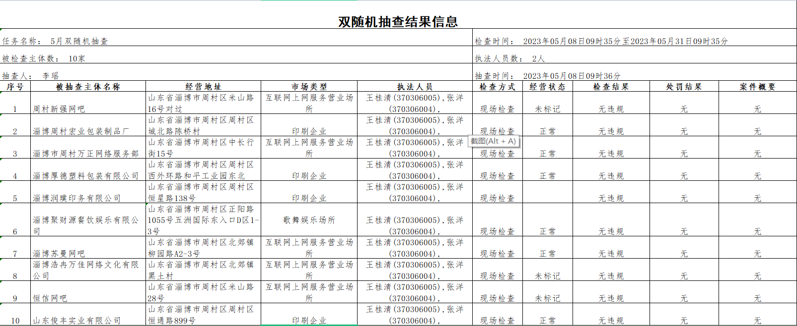 周村区文化和旅游局2023年5月“双随机、一公开”抽查结果