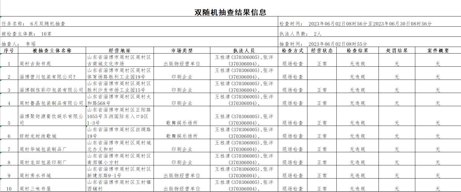 周村区文化和旅游局2023年6月“双随机、一公开”抽查结果