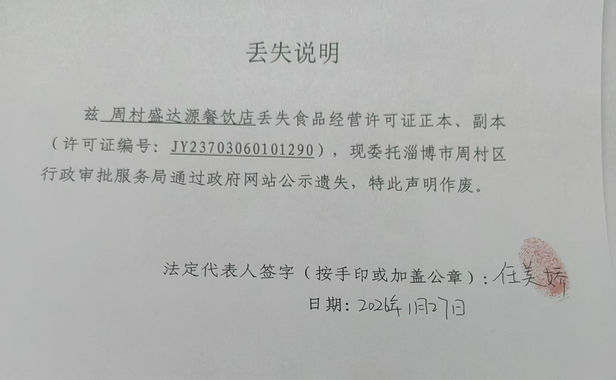 周村盛达源餐饮店丢失食品经营许可证正本、副本