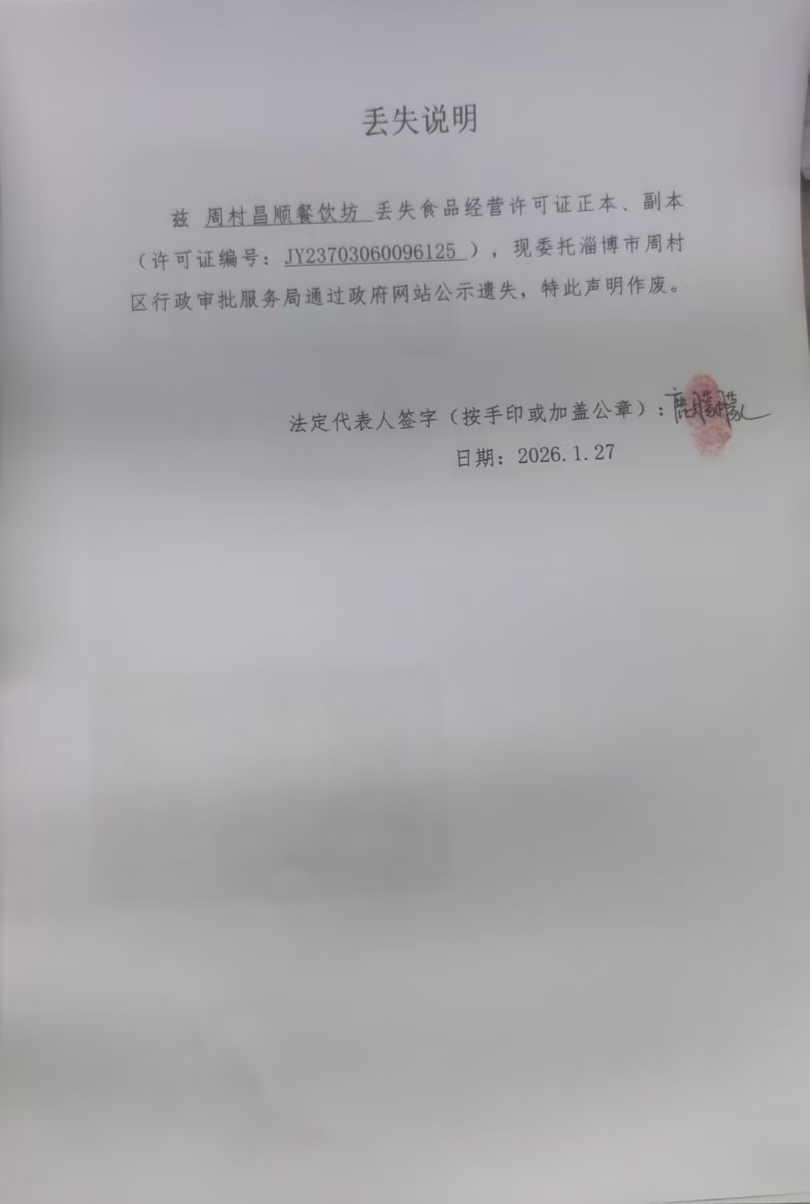 周村昌顺餐饮坊丢失食品经营许可证正本,副本